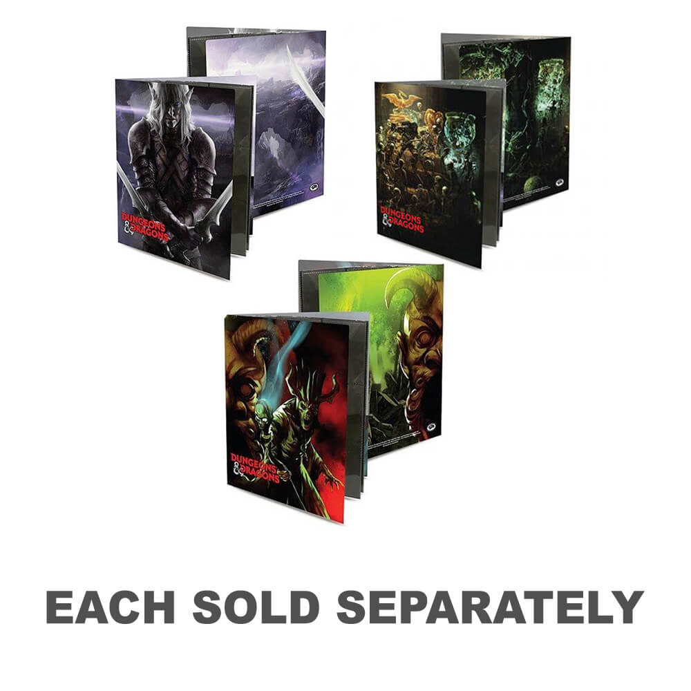 Organize your character sheets and stats with Ultra PRO's Dungeons & Dragons Character Folio. Each folio is printed with detailed full-color graphics featuring your favorite theme from the popular role playing game Dungeons & Dragons. Sheet protector pages in the folio can hold up to ten 8 1/2" x 11" character sheets and two 18-pocket sheets hold 36 standard size Spell Cards. The cover of the folio includes front and back inner pockets.